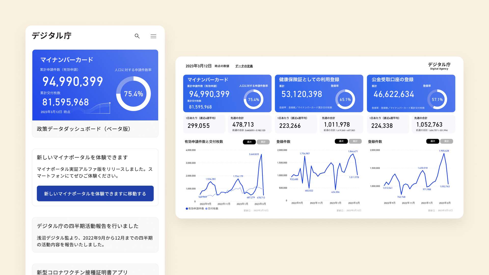 志水 サービスデザインの浸透や、データ主導の文化づくりをしています。例えば、2022年12月に「政策データダッシュボード」をリリースしました。マイナンバーカードの普及率や健康保険証としての利用登録数など、マイナンバーに関連する政策の進捗を誰でも確認できます。