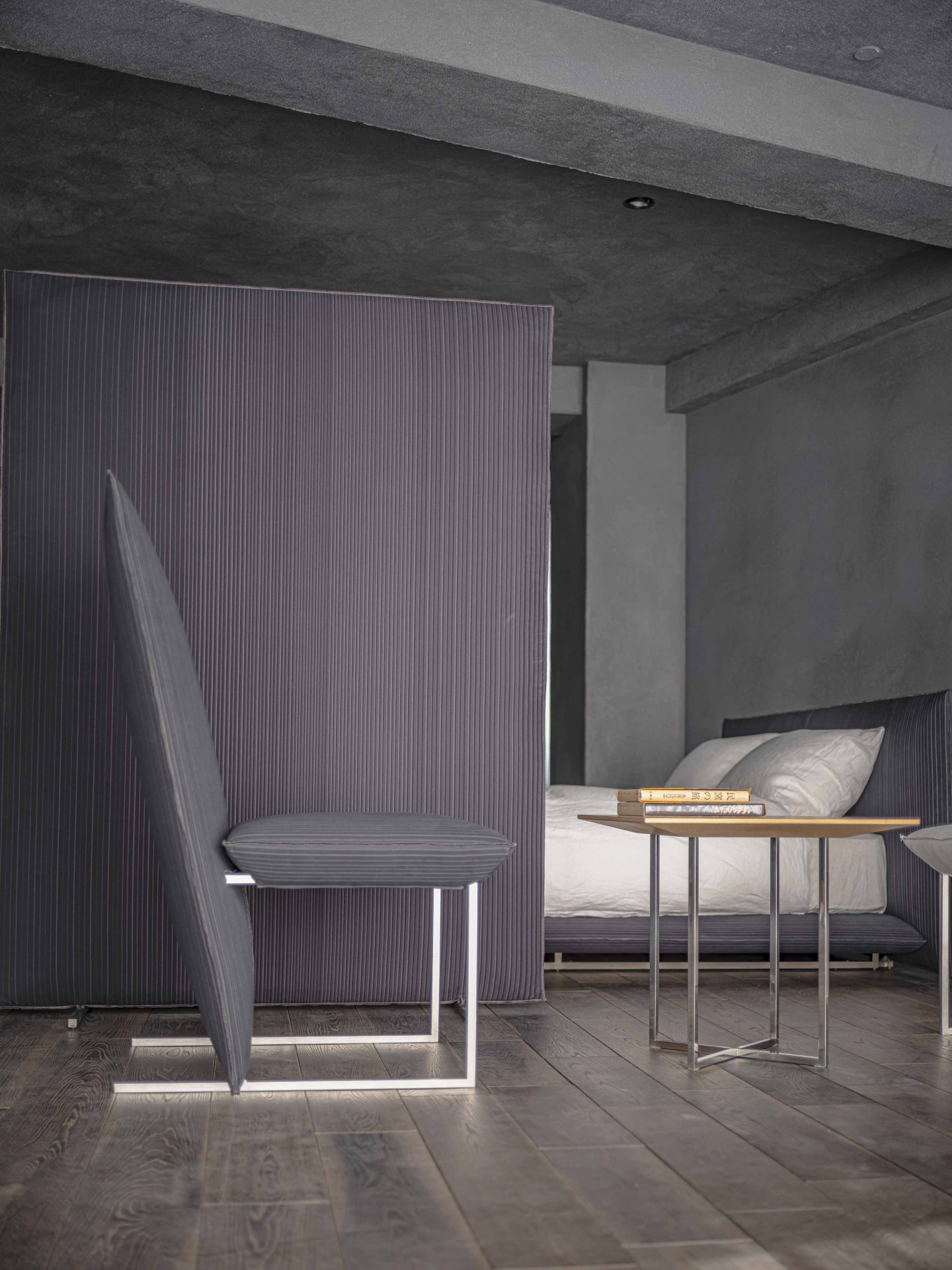 「FU」は「座布団を2枚組み合わせたようなソファができないか」という隈の言葉をヒントにデザインされた。フレームの端部を摘まんだような形状は、柔らかさとシャープさをあわせ持っている。