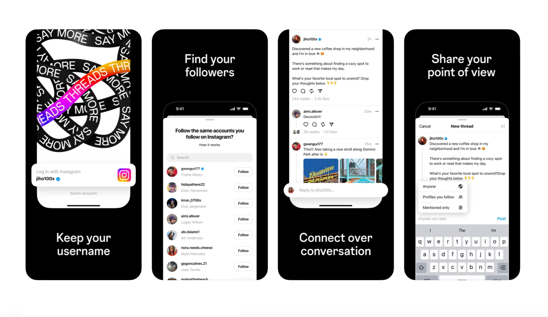 Threadsはテキストベースの会話アプリで、Instagramのアカウントでログインができる。好きなクリエイターや共通の関心をもつ人をフォローして直接つながったり、フォロワーに向けてアイデアや意見を発信・共有することも可能だ。