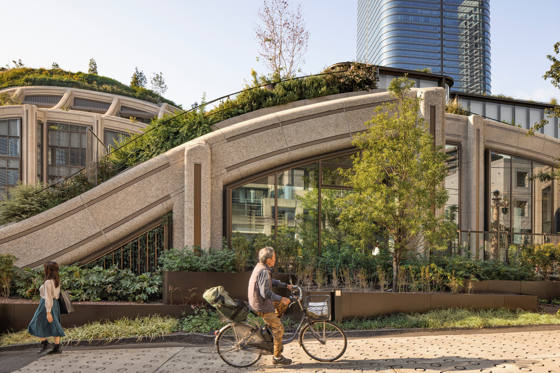 木々や花々、水辺に囲まれて波打つような独特の建築は、居住者やオフィス通勤者、麻布台ヒルズを訪れる人の結びつきを意図して設計。曲がりくねった道や遊歩道を兼ねた屋上のスロープにより、くつろいだ雰囲気を演出している。
