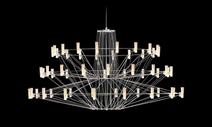 「COPPELIA(コッペリア)」moooi(2015)。伝統的なキャンドルのシャンデリアをモチーフに考えた。moooiの技術により、細い金属のワイヤーが配線の役目を果たしている。日本では、moooi Japanやトーヨーキッチンスタイルのショールームで販売されている。