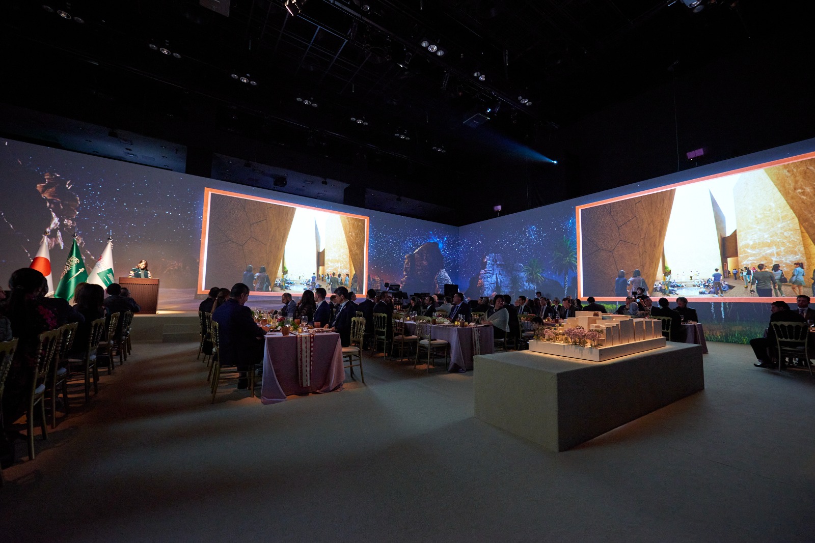 ガラディナー会場の四方の壁には、サウジアラビアの夜の風景をイメージした映像が映し出され、まるで静かな砂漠のなかのオアシスにいるような雰囲気が演出されていた。