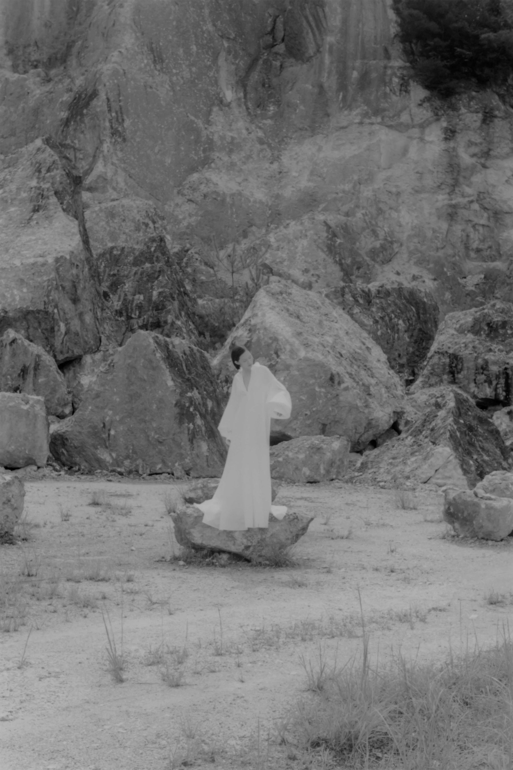 ビジュアルは、17世紀初めに朝鮮陶工・李 参平が磁器の原料となる陶石を発見し、日本で初めて磁器が誕生した場所「泉山磁石場」や磁器製鳥居などの有田焼の名工たちによる作品が境内に点在する1658年建立の「陶山神社」など、有田町の各所にて撮影。写真家の野田祐一郎がモノトーンと⻘を基調とする深淵な世界で鮮やかに捉えた、今シーズンを象徴するピースに注目だ。End