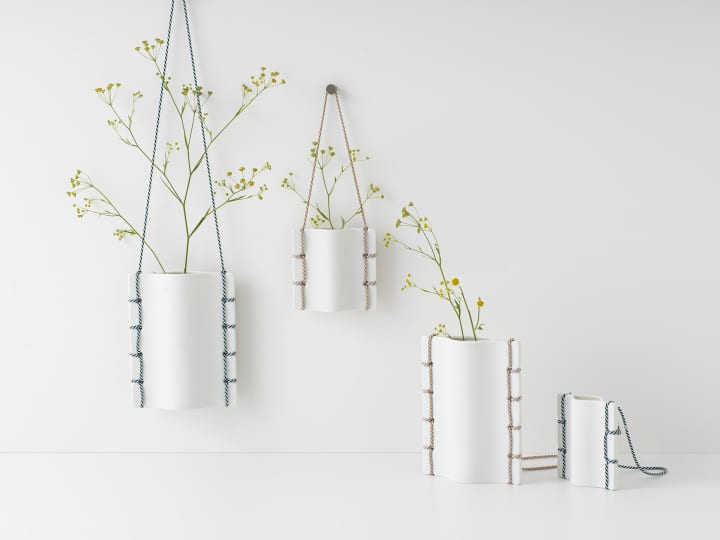 この1月末のドイツの国際見本市アンビエンテと、2月の東京インターナショナル・ギフト・ショーで発表した最新作は、セラミック・ジャパンの「WATOJI」。京都の組ひもを用いて、日本古来の製本技術である和綴じをモチーフにしたハンギングタイプの陶磁の花器だ。「RELIEF」のガバ鋳込み製法や「WATOJI」の組ひもといった伝統産業は、後継者不足を含めたさまざまな理由で減少の一途をたどっている。そうした技術や素材をデザインに採用することで、その美しさと素晴らしさを世界に発信するとともに、未来へとつなぐ一助になればという思いも込めていると語る。