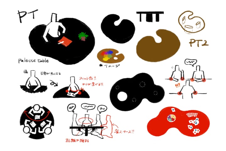 「Palette Table-波紋-」のアイデアスケッチ。絵の具を混ぜるパレットをモチーフに、「使う人にとって暮らしを彩る家具」を目指してデザインを考えた。