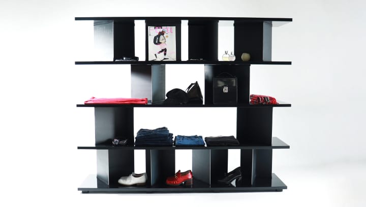 最初の1年間に、見せる棚「BUTAI」と隠す棚「karakasa」を製作。「BUTAI」は、たいていの本棚が等間隔に仕切られているため、飾るものの大きさが限定されたり、背表紙のデザインに連続性があるシリーズ本を分割して置かなければならないといった小さなストレスが発想の原点となった。支柱兼仕切りの役割をもつ鋼板を固定せず、自由に配置できるようにして、好きなものを好きな場所に飾り、独自の世界観を創造できる棚を製作した。