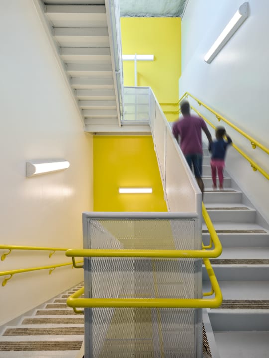 さらに、優れたエネルギー効率を実現するべく、パッシブデザインを採用した。壁や屋根に断熱材を施して熱効率を高め、三層ガラス窓により目の前の高架橋を走る地下鉄や交通量の多い道路の騒音を抑制する。また、屋上に設置された空調システムが、汚染物質の除去と除湿を行い、各部屋に新鮮で心地よい空気を送り込む。
