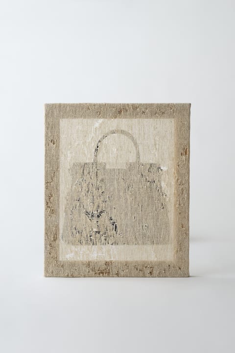 Nerholは、カンバスを用いた「Canvas(Nusa)」を制作。職人の協力のもと、貴重な大麻(おおあさ)の繊維で紙を漉き、その紙を細切りにしたうえで紙を撚って糸にし、それを織機で織り100%麻の紙のカンバスをつくった。さらに、平織りとジャカード織りを使い分けて表情に変化をつけたカンバスの表面を、穴が開くほど擦り、削りとって、そこに牛の膠(にかわ)を塗り重ねた。カンバスの網目の向こう側に「5AC」を配置することで、バッグの輪郭や素材が立ち現れる。