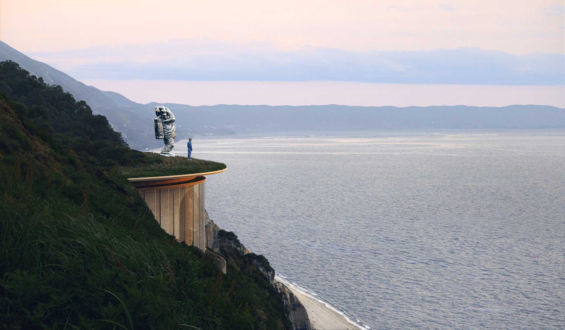 同ホテルは、谷地に埋まるように崖や周囲の自然と一体化する設計がなされており、屋上にはアメリカのアーティスト KAWSによる巨大な彫刻「SPACE」を設置。室内にはNIGO®が厳選したアンティーク家具やアート作品を配するなど、建築とアートが融合した唯一無二のヴィラを提供する。