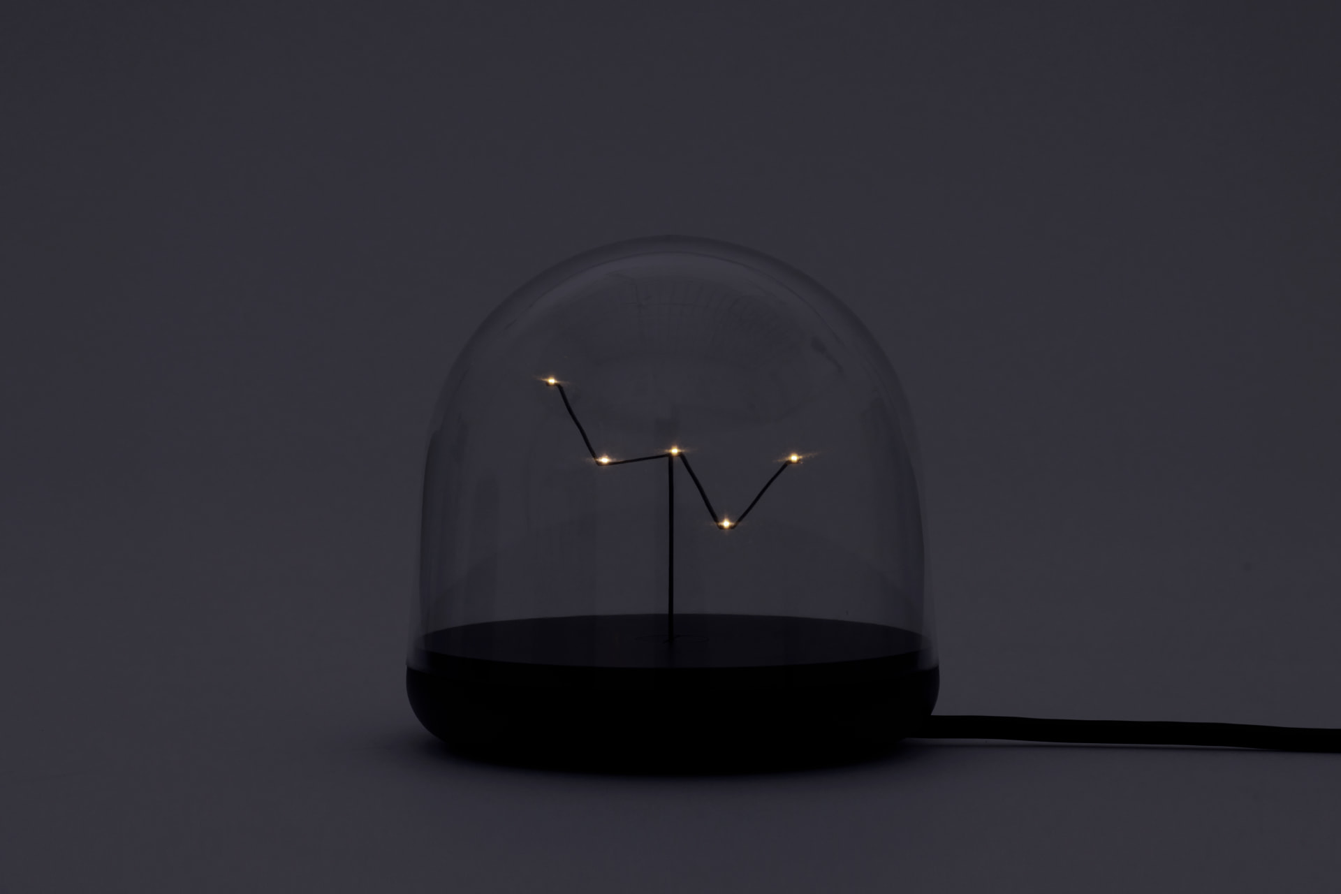 一方、「CONSTELLATIONS」は、国際天文学連合(IAU)が発表している図をもとに、チップLEDを細い帯でつないだ立体基板によって星座を表現した照明作品だ。ペンダント照明には黄道十二星座を、置き型照明にはカシオペア座をかたどった光源を組み込んでいる。