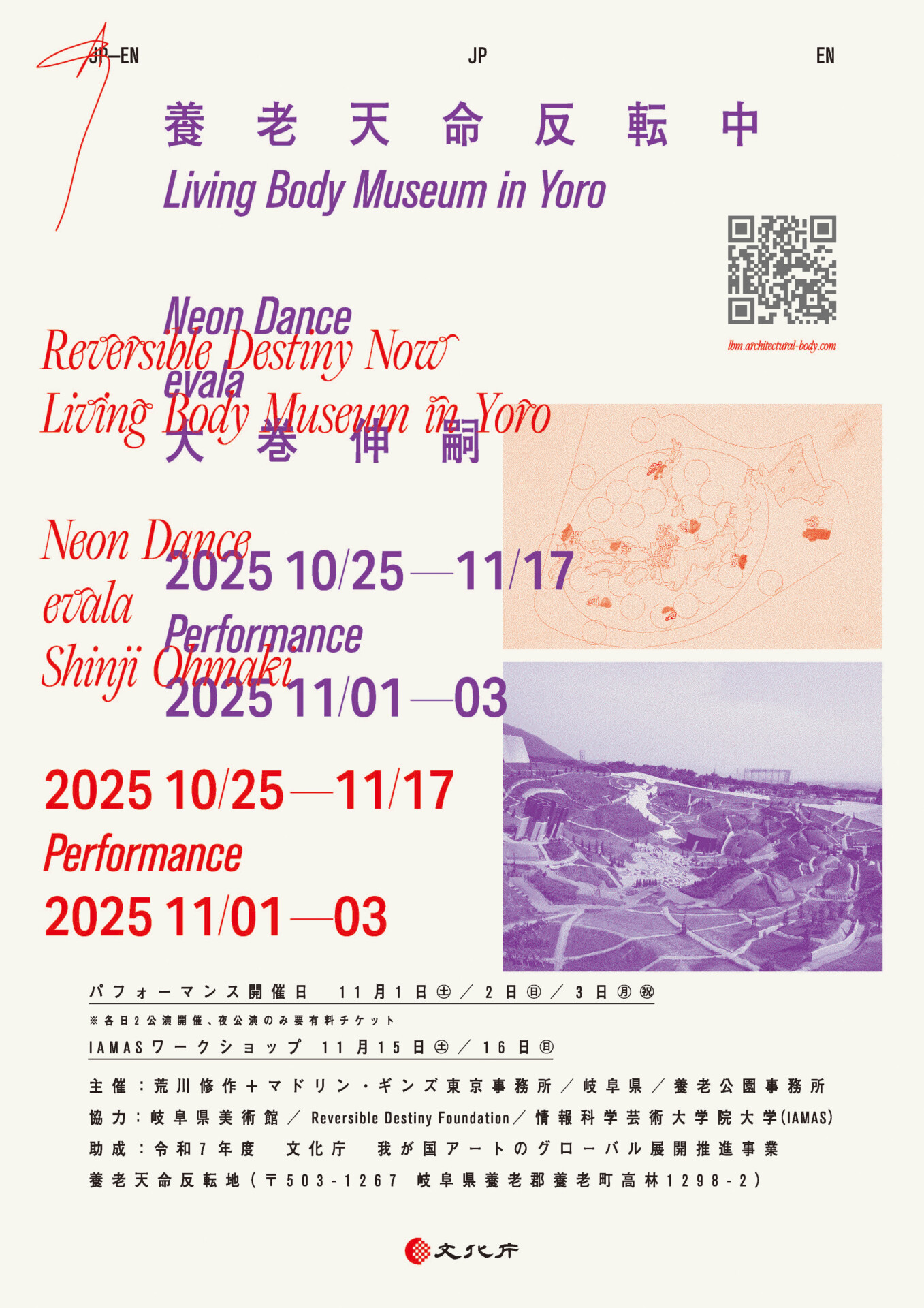 本イベントには、英国のダンスカンパニーNeon Dance、サウンドアーティストevala、美術作家の大巻伸嗣が参加し、インスタレーションやパフォーマンスを展開。特に、2025年11月1日(土)から3日(月・祝)までの3日間は、夜の養老天命反転地を舞台に音と光、ダンスが融合する特別公演「Living Body Museum in Yoro (night version)」が上演される。月明かりに照らされた幻想的な空間でのパフォーマンスは、この場ならではの歴史的体験となるだろう。