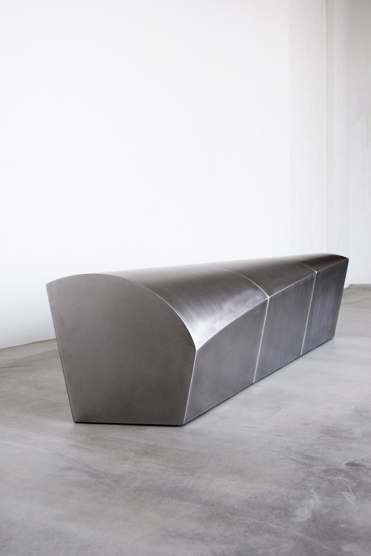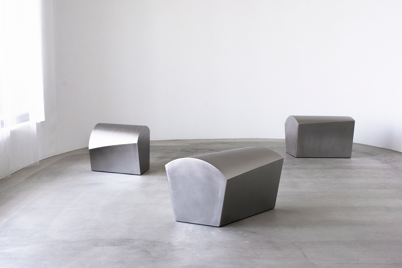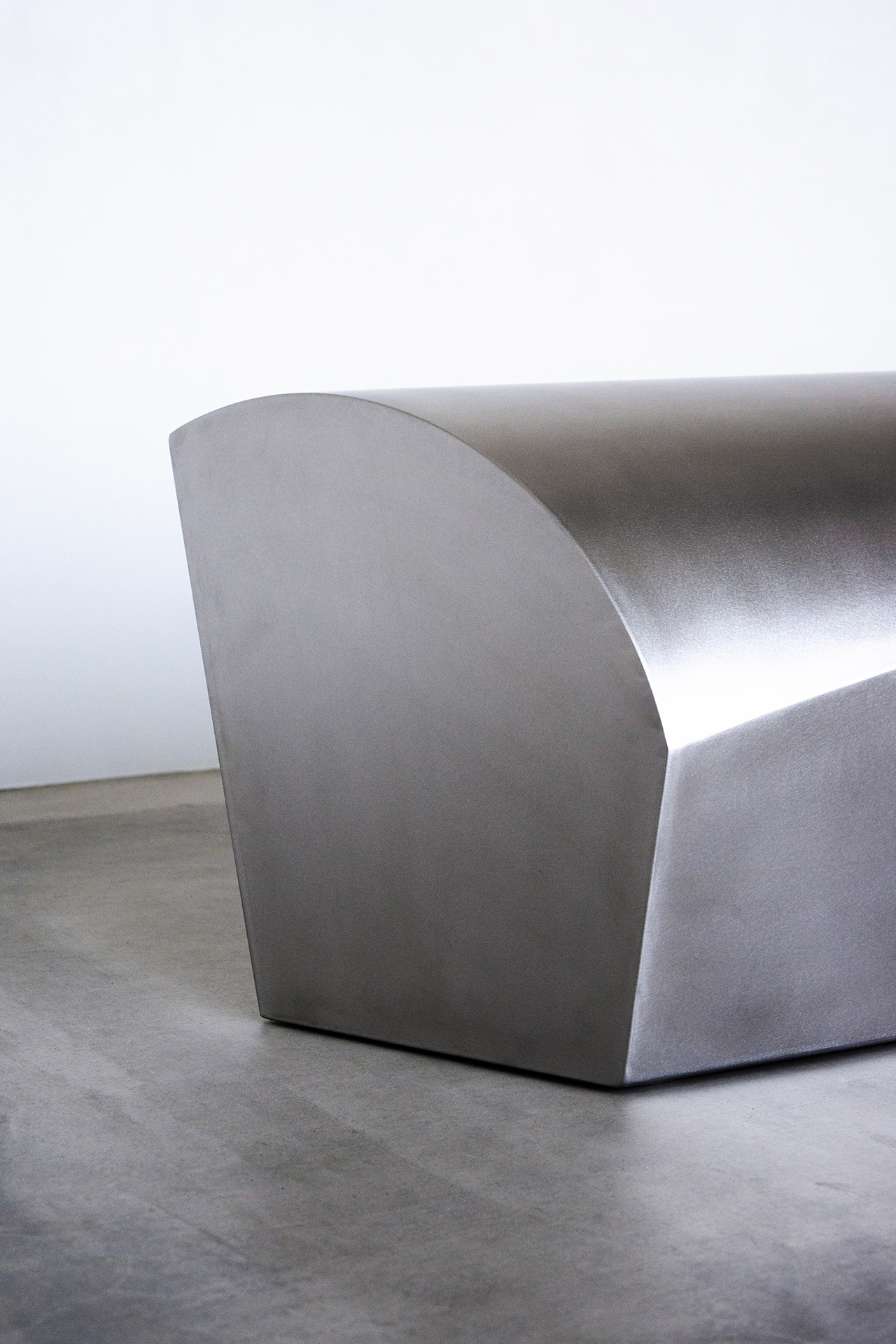 「人が主役の美術館」を理念とする同スタジオに設置されるこのベンチは、座るという本来のベンチの機能をもちながら、空間に強い存在感を放つオブジェとしてデザインされている。直線と曲線が交わるフォルムは彫刻的であり、ステンレスの冷たく硬質な質感は、人が座ることで温もりを際立たせ、そこにいる人の存在そのものを引き立てる。
