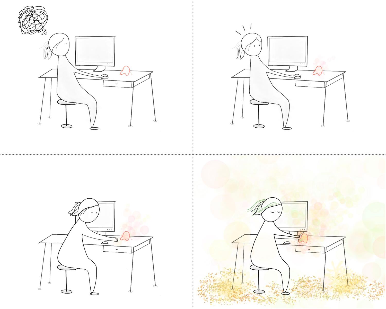 デバイスには複数のモードが搭載されており、利用シーンに応じて多様な触覚体験を提供する。コンパニオンモードでは、近くに人が近づくと柔らかく光を放ち、タップ操作に応じて微細な振動を返すことで、まるで対話を交わすようなインタラクションが生まれる。