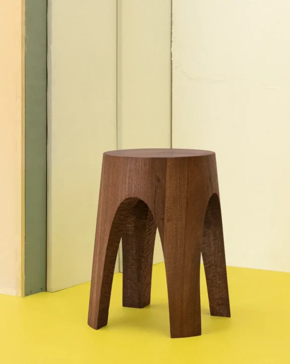 「MOSTAR STOOL」は深澤直人による作品で、現代的なデザインと丸太から彫り出したような原初的な造形を併せ持ち、脚部のアーチはボスニアの都市モスタルにある古い橋をモチーフに、人々の繋がりを表している。滑らかな外側と対照的な座面裏の手彫りが、職人の巧みな技を感じさせる。
