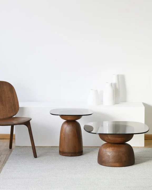 モニカ・フォレスター(Monica Forster)による「NERA TABLE」は、スモークガラスの天板と手彫りのベースの組み合わせが特徴で、ガラス天板と脚部の対比が美しく、オブジェとしても空間を彩る。また、パトリック・ノルゲ(Patrick Norguet)のデザインによる「SAVA ARM CHAIR」は、三日月形の湾曲した背もたれとファブリックを張ったパディングシートが組み合わされ、アーム裏のカービングに手彫りの感触を味わえる。![]()