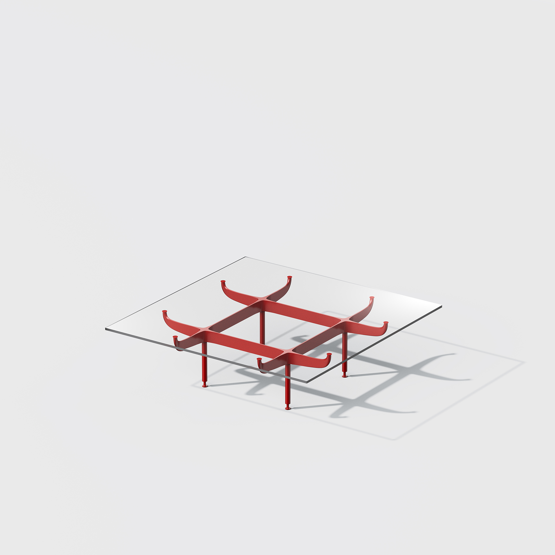 骨格を思わせるフレームがガラス天板を点で支える構造が特徴のテーブル。4種のガラス天板と5種のフレームから選べ、組み合わせや拡張が可能。自然と植物、生物のすがたを想起させつつ、会話を生み出す。