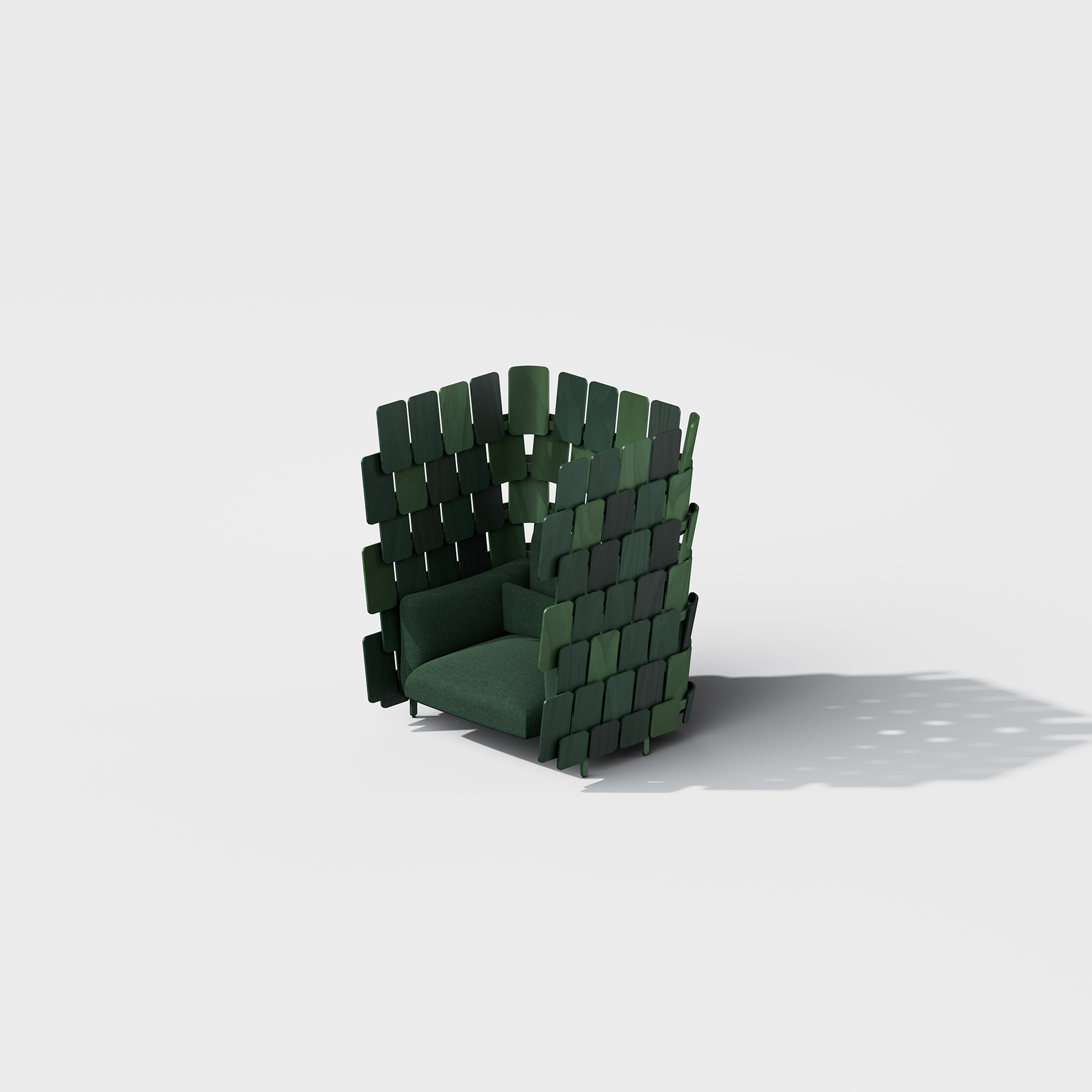 隙間が光や風を通す鱗状のパネルが特徴的なディバイダー兼ソファ。プライバシーレベルに合わせて3種類の高さから選択でき、外の空間とのつながりとプライベート感を両立しながらコミュニケーションを促す。