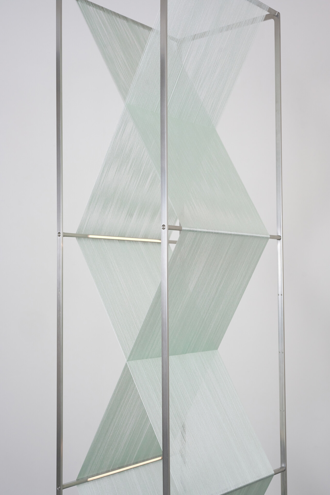 本作は、機(はた)にかけられた絹糸が織物になる前に見せる「縦糸そのものの美しさ」に着想を得たもの。千本以上の絹糸がつくる縦の線が、やや透明がかった平面を構成し、その平面が曲がり折り重なることで独特の表情を生み出す。「布になると失われてしまう、多数の糸がつくる魅力をシェードとして照明にしてみようと考えた」と坂下は語る。