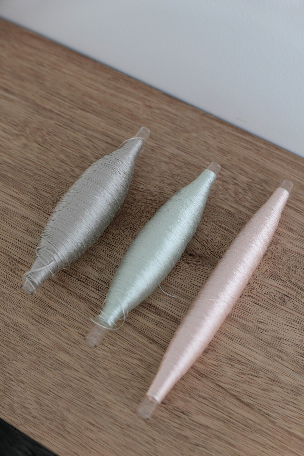 草木染めの絹糸に極細LEDを組み込み、糸の内部から柔らかな光を灯す構造。染色は坂下涼佳が担当し、青は臭木(クサギ)、グレーは白樫(シラカシ)、ピンクは茜(アカネ)で染められた。クサギの実は京都の山里で採取し、白樫は剪定された庭木を譲り受けたもので、地域の自然素材を用いている。