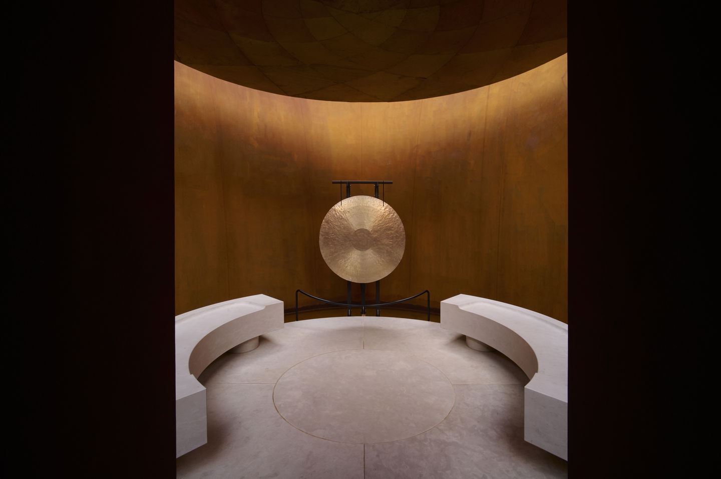 来訪者は、銅鑼とフルートの音色が響く中、曲線を描く通路を壁沿いに進む。この形状は、ドーシが夢の中で見た「2匹のコブラが絡み合う姿」に着想を得たものだ。通路の地面には凹型の窪みがあり、そこから音が拡散される。終点の瞑想室には、インドで手打ちされた真鍮製のマンダラが天井に配され、屈折した光を空間に投げかける。