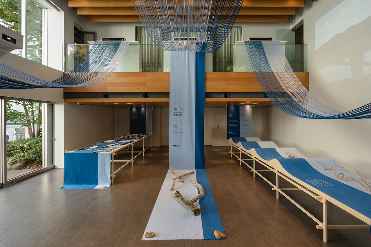 会場では、コレクションに至るリサーチプロセスも見ることができた。同社のデザイナーが自ら撮影した琵琶湖の写真は、刻々と変化する光や色の表情をありのまま伝え、インスピレーションの源となった風景を来場者に共有するものだった。また、フィールドワークで採取した流木や素材サンプルも展示され、自然の質感やリズムをどのようにデザインへ昇華していったかが可視化されていた。