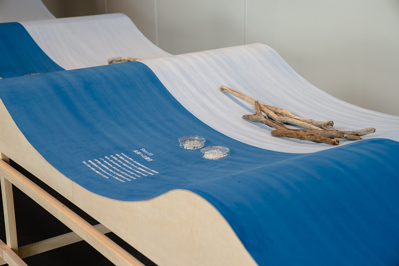 波翳(手前)と東雲に染めたウルトラスエードを張った什器。琵琶湖で採取した流木と、ウルトラスエードの原料となる植物由来ペレットが展示されていた。※流木は、市の許可を得て採取したもの。