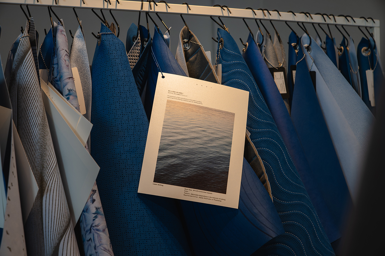 「波翳」は、水面に映る光の揺らぎを重ねた多層的なブルーが特徴で、力強さと静けさを併せ持つトーンが車内に落ち着きをもたらす。一方、「東雲」は、朝の光が湖に反射する瞬間を写し取った淡い色調で、空間に広がりと透明感を与える。2色それぞれが異なる魅力を持ちながら、車内という閉じられた空間に自然の色彩を取り込む提案として、インテリアデザインの可能性を広げる内容となった。