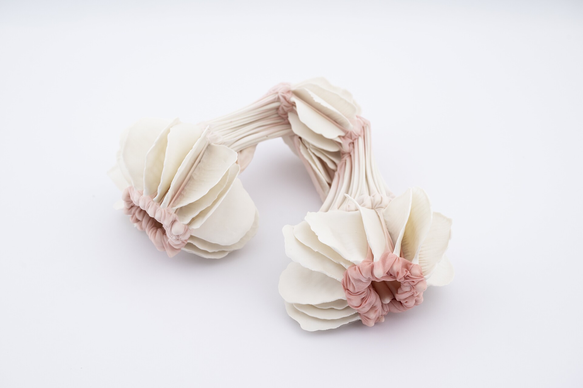 ダニエラ・ベルクシュナイダー(Daniela Bergschneider)《Flex V》2025年 磁器、染色ナイロン生地、35×18×20cm Courtesy of the artist and Skog Art Space. Credit: Thor Brødreskift