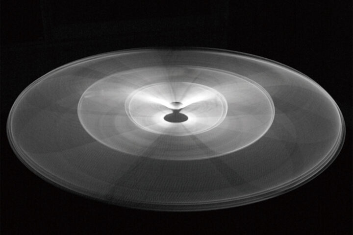 「CLEAR」(2009)。武蔵野美術大学造形学部空間演出デザイン学科の卒業制作作品。細い線状の発光体が高速で回転し、面として立体的に立ち上がることで、透明な光が揺らいで見える。