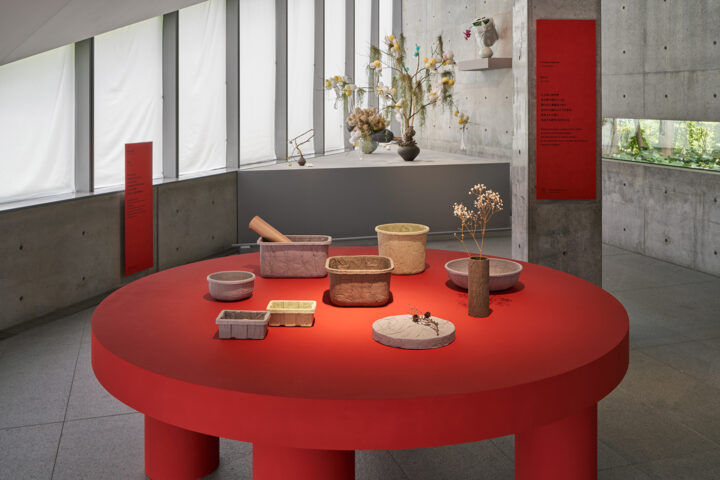 「beyond form / かたちなき野性 GUSHA GUSHA, KUSHA KUSHA」IM MEN(2024)。5名の作家が特殊な形状記憶性をもつIM MENの新製品バッグを用いて作品を制作。展覧会ディレクターを吉添が務めた。Photo by Masaya Yoshimura, ©︎ISSEY MIYAKE INC.(手前:鈴木 元「Everyday Objects」、奥:渡来 徹 「委ねられた輪郭」)