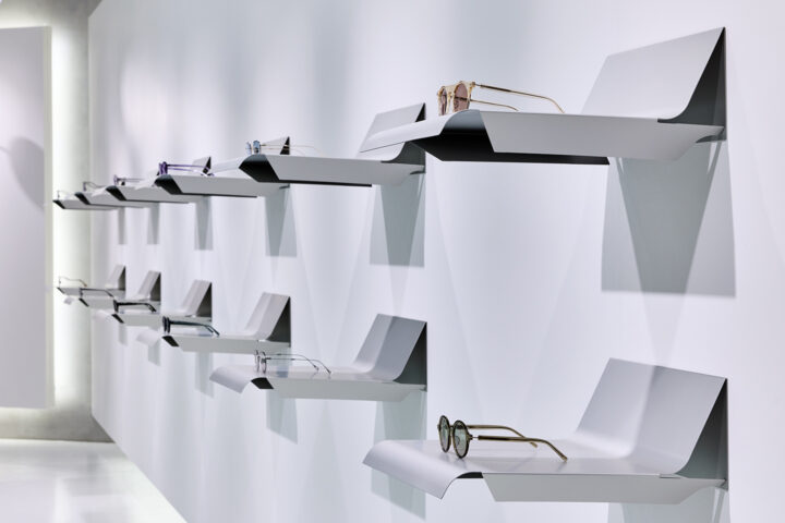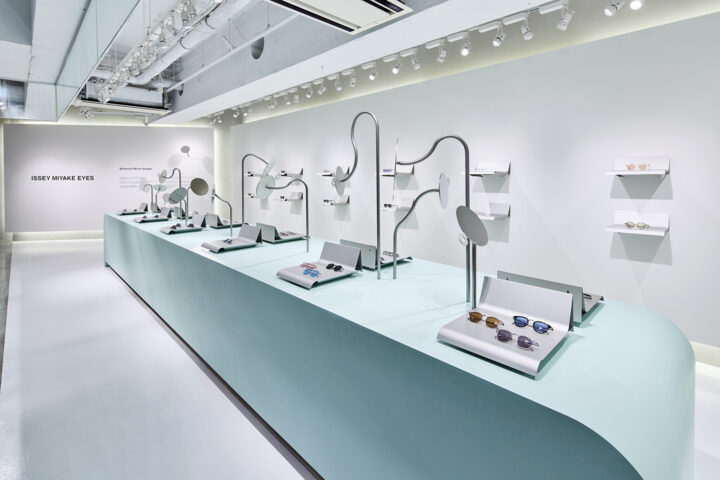 「Botanical Mirror Garden」ISSEY MIYAKE EYES(2024)。ISSEY MIYAKE EYESの展示空間と什器デザイン。植物のように有機的なラインを描く複数の鏡を用いて構成した。©︎ISSEY MIYAKE INC.