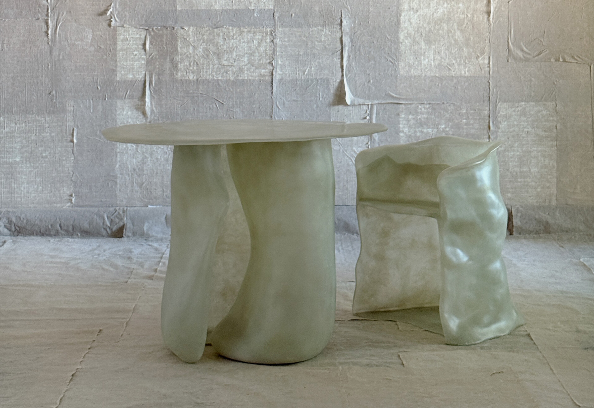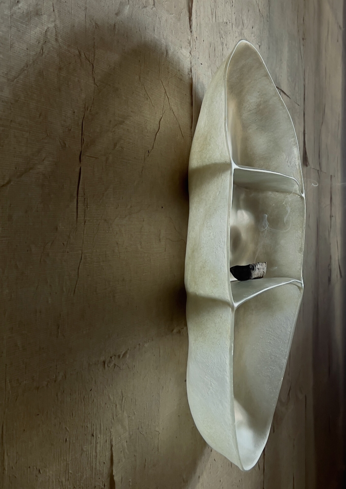 素材にはガラス繊維強化プラスチック(FRP)を採用。単層構造で手作業により成形されるため、表面には交錯する不規則な繊維の質感が現れ、裏面には繊維が白く浮き出る。光が透過する際に淡い陰影が生まれ、透明感と質感が共存する独特の表情を見せる。自然で不規則なシルエットと素材の特性が生み出す曖昧さが、「形に執着しない」佇まいを体現している。