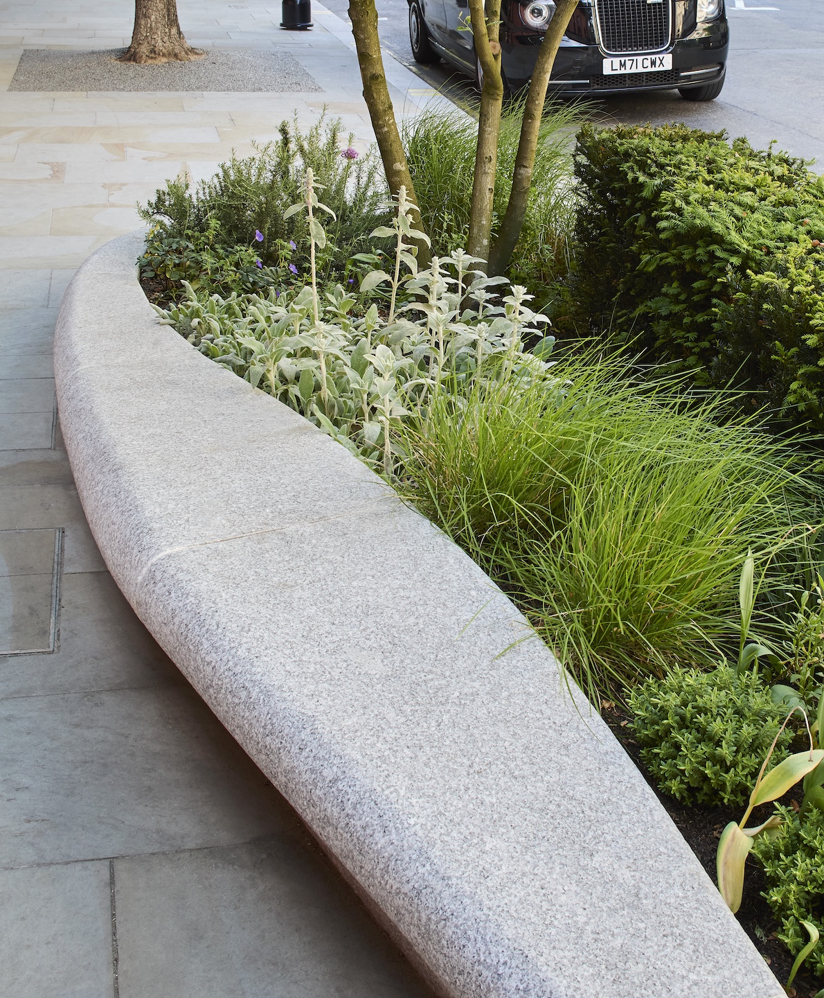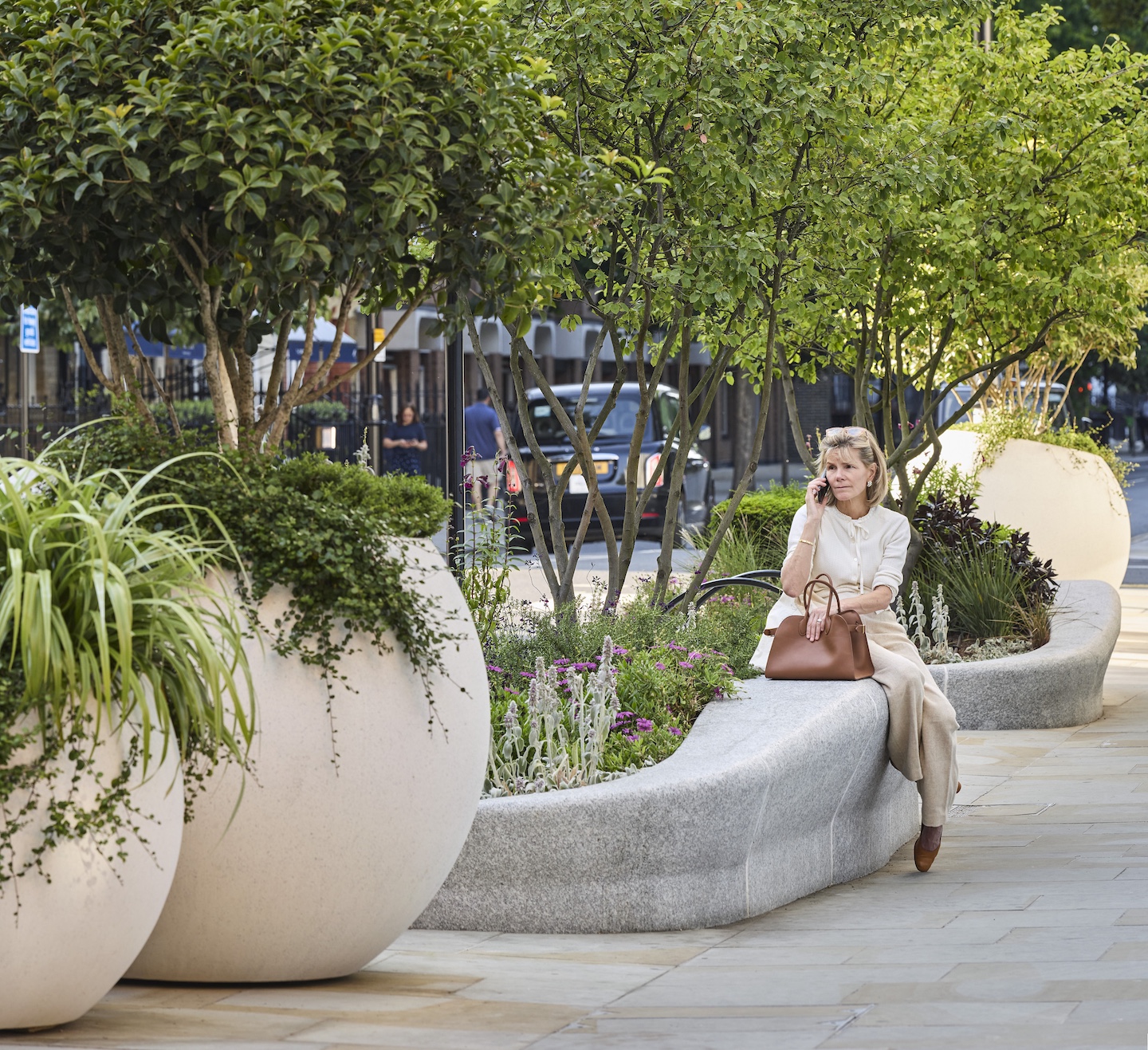 彼らはこの通りの歩道を増幅し、100本以上のライム、ジューンベリー、金木犀の木を植樹した。また植樹と並行して、60基以上のプランターに気候変動に強い低木、花、観賞用多年草を厳選し、年間を通し季節の色を吟味した多様な植栽を展開することにした。花崗岩でできた花壇の縁はそのまま腰掛けることができるアウトドアファニチャーの役割を果たし、車道と歩道の間の緩衝ともなっている。