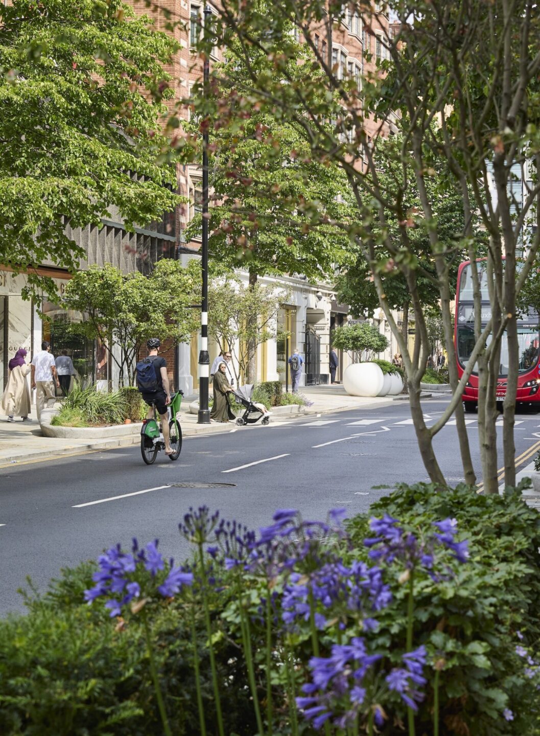 マスタープランナーでランドスケープアーキテクトであるジョン・マカスラン+パートナーズ(John McAslan + Partners)と、やはりランドスケープアーキテクトで園芸デザインを手がけたアンディ・スタージョン・デザイン(Andy Sturgeon Design)が連携して変えたロンドンのスローン・ストリートの姿はそれに比べるとずいぶんと控えめだ。車道を削減し、歩道部分を20%増幅してそこに緑を増やすというシンプルなもの。しかし、そのことによる効果は思いのほか大きい。都市緑化係数が17%増え、生物多様性も175%促進されたという。