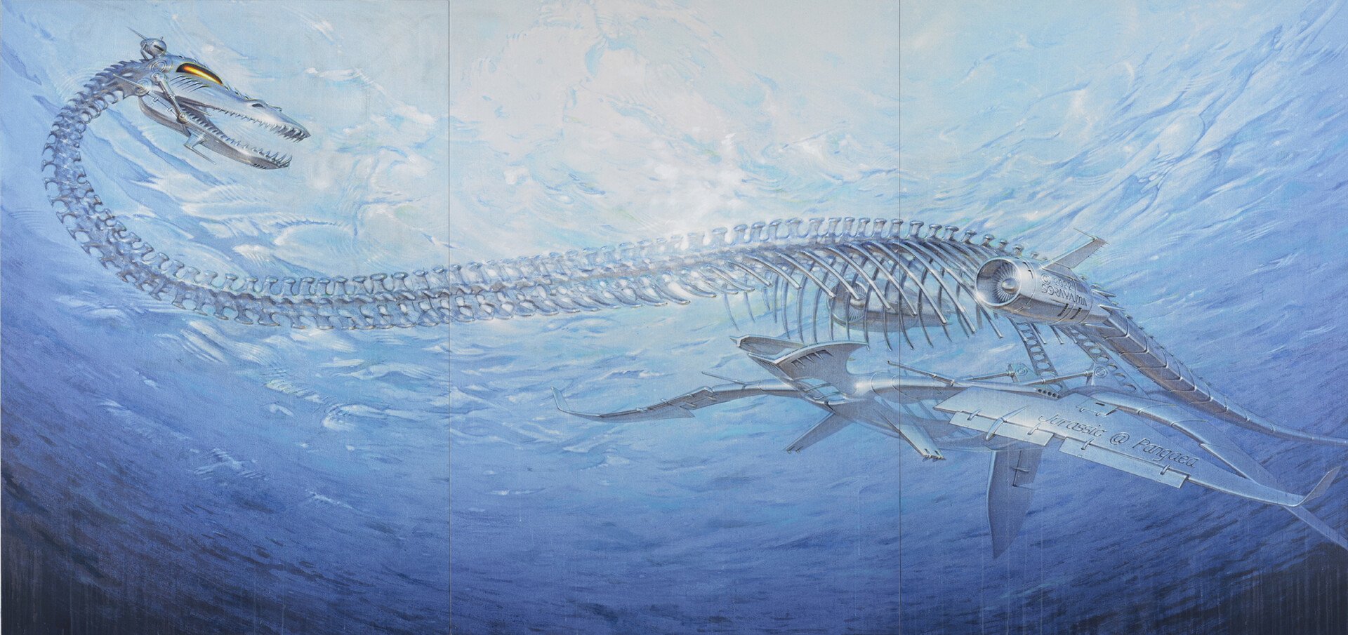 空山基 「Untitled」(2022)アクリル絵具、デジタルプリント、キャンバス H197 x W418.2 x D4 cm (三連画)