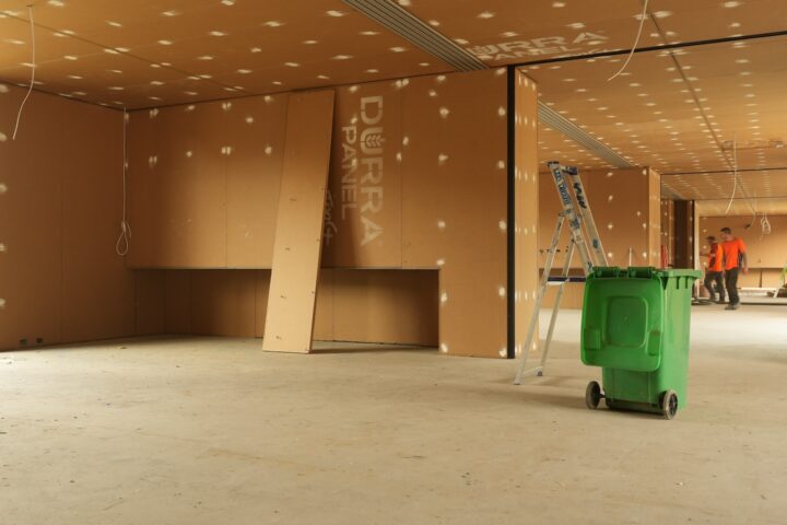 施工中の様子。壁には藁を熱で圧着してつくるサステナブル素材、デュラパネルが使われている。このパネルは、耐火認定を得た素材としてオーストラリア内の公共建築の壁や天井などにも広く使用されている。Photo by Frank Burridge