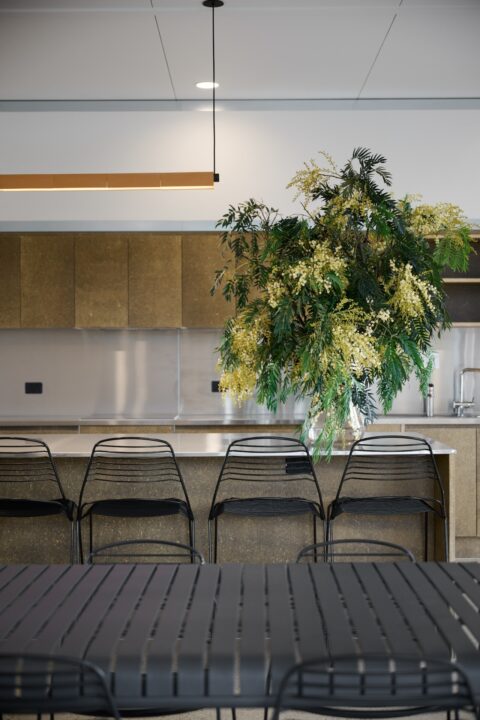 設計を担当した建築家フランク・バーリッジとヨーストは、屋上緑化した建築の断熱性能は、現状の算定方法ではきわめて低く見積もられてしまうが、保水力のある土壌の効果で夏は室内の温度を下げ、冬は大きな断熱効果を発揮すると説明する。内装の仕上げに目を向けると、ビクトリア州のベンディゴで生産される、工場から100km圏内で採れる藁を原材料とするデュラパネルを壁に、また、ヘンプをバイオマスエポキシで固めた素材をテーブル天板に用いるなど、環境負荷を抑える素材が厳選されていた。