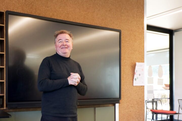 ここから話題は、校舎のデザインに及んでいく。続いて登場した環境活動家のヨースト・バッカー(Future Food System)は、Mclldowie Partnersのコラボレーターとして「リジェネレイティブ・フューチャーズ・スタジオ」のデザインに密接に関わった人物だ。フラワーアーティストとしてキャリアをスタートした彼は、2006年に大量の藁を壁に用いた自宅が国内外から注目を集め、その後もゼロ・ウェイスト・レストランの運営やグリーン建築のプロジェクトを実践してきた。自然を愛するヨーストにとって、建築を建てるときにいちばん気にしているのは、土地が生き物の生息地となる機会を奪ってしまうことだという。当然、この校舎でもその点に配慮し、平屋建ての建物の屋上は彼のアイデアからすべて緑化され、地域の在来種を含む多様な植生が草原のように生い茂っていた。