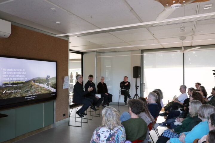 2025年1月の開設以来、サステナブルなコンセプトで話題になっている、オーストラリアにある「Woodleigh School(ウッドレイ・スクール)」の新校舎「リジェネレイティブ・フューチャーズ・スタジオ」。設計を手がけたのはメルボルンの建築事務所Mclldowie Partnersだ。ここで開かれたトークイベント「CLIMATERELAY: BUILDING」では、普段、一般の人が立ち入ることの難しい私立学校内を見学でき、同スタジオの設計者であるフランク・バーリッジ(元Mclldowie Partners、現在はMain&Frankを共同主宰)はじめ、クリエイティブシーンを牽引する理論家たちが登壇するとあって、会場は満員となった。