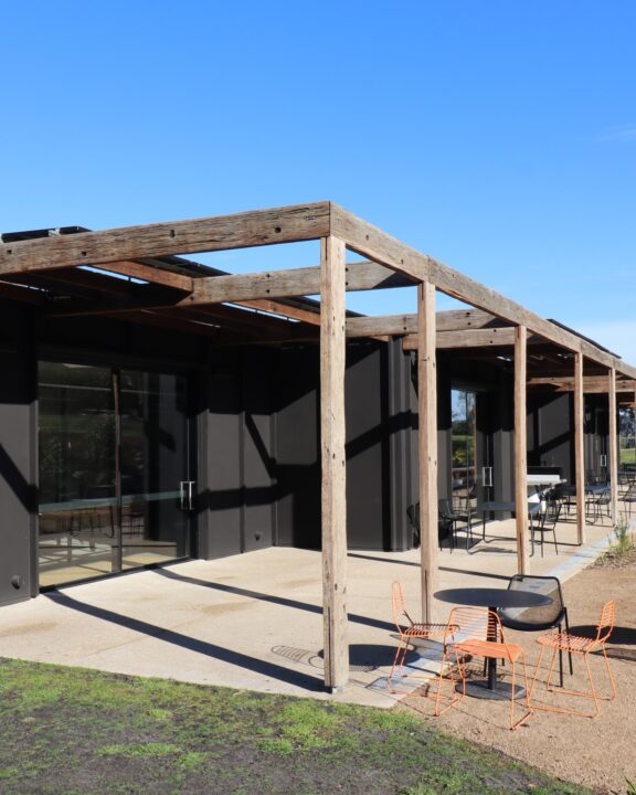 パーゴラ状のグリッドは、セント・キルダ埠頭に使われたデッキ材の表面を研磨したうえで再利用している。