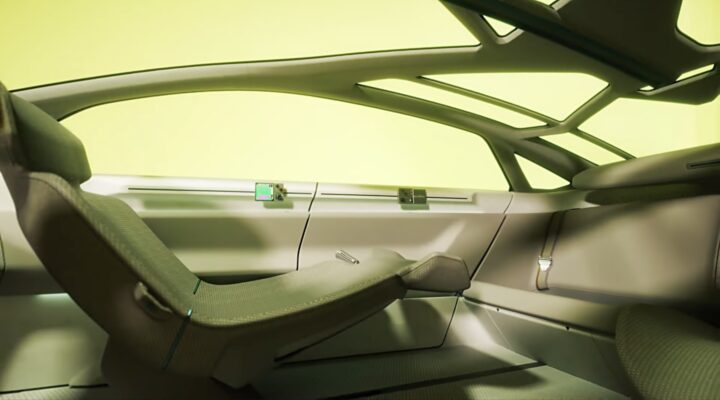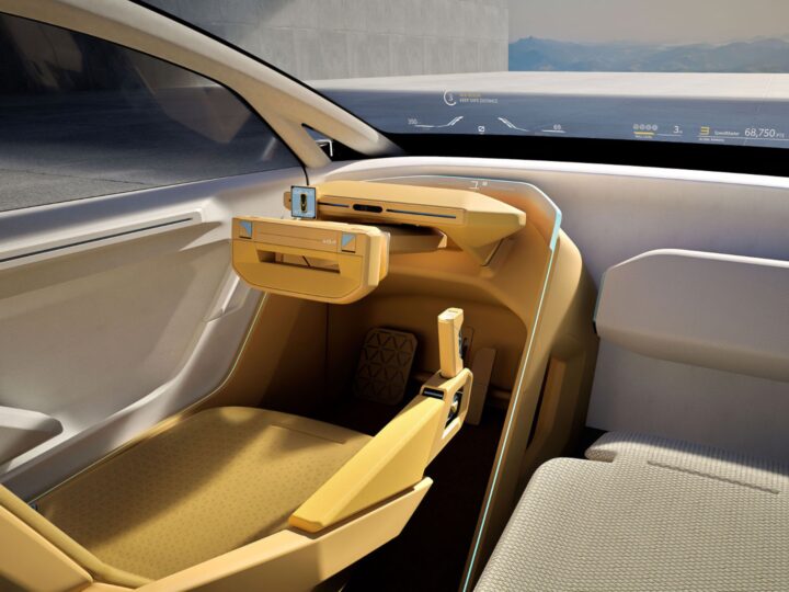 加えて、ステアリングは格納式で、ドライバーズシートを前方に電動で移動させると、操縦桿のようなコントローラーも邪魔にならない位置までスライドし、キャビンスペースを最大化できるように工夫されている。これは停車時にくつろげる空間をつくり出すとともに、将来的な完全自動運転時のシートアレンジを示唆しているようにも思える。