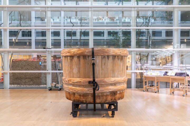 最初に見えるのは大きな樽。地元の味噌メーカーである光浦醸造から、実際に使っていた発酵樽を借り受けたという。人が入るほどの大きさの発酵樽は、美術の展覧会としてかなり異質であるが、会場全体の機械的な風景のなかで、人工物と自然物の中間のような存在感を示している。