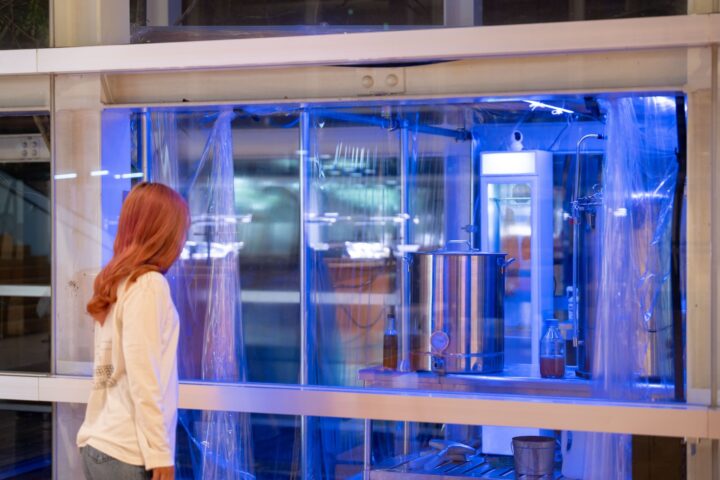 さらに、水槽の奥には、ブルーライトに照らされた工業的な装置が見える。イノシシの肉を加水分解する装置だという。今回の展示で最も妖しげな、どこか宗教的な雰囲気を感じさせる一角だ。