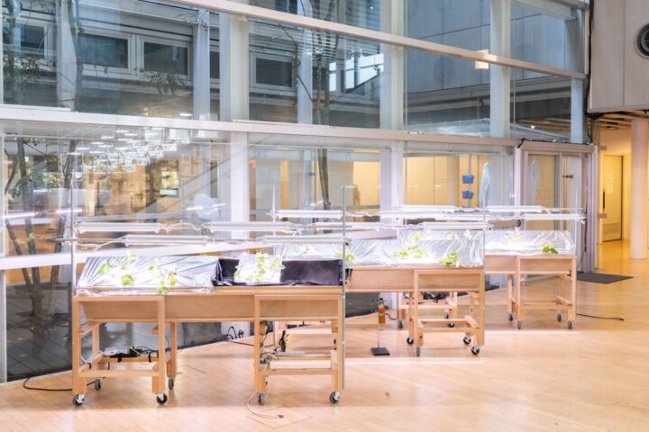 展覧会準備期間から、地元の生産者や研究者にアドバイスをもらいながら、会場では地域特有の植物「はなっこりー」などを育てている。これも、YCAMが所在する地元・山口の人たちとコミュニケーションをするための仕掛けだ。研究室あるいは工場のような、あえて美術館らしくない、どこか見覚えのあるような風景を想起させるのも、現在起きている現実からそう遠くないことであると感じてもらうことを意図している。