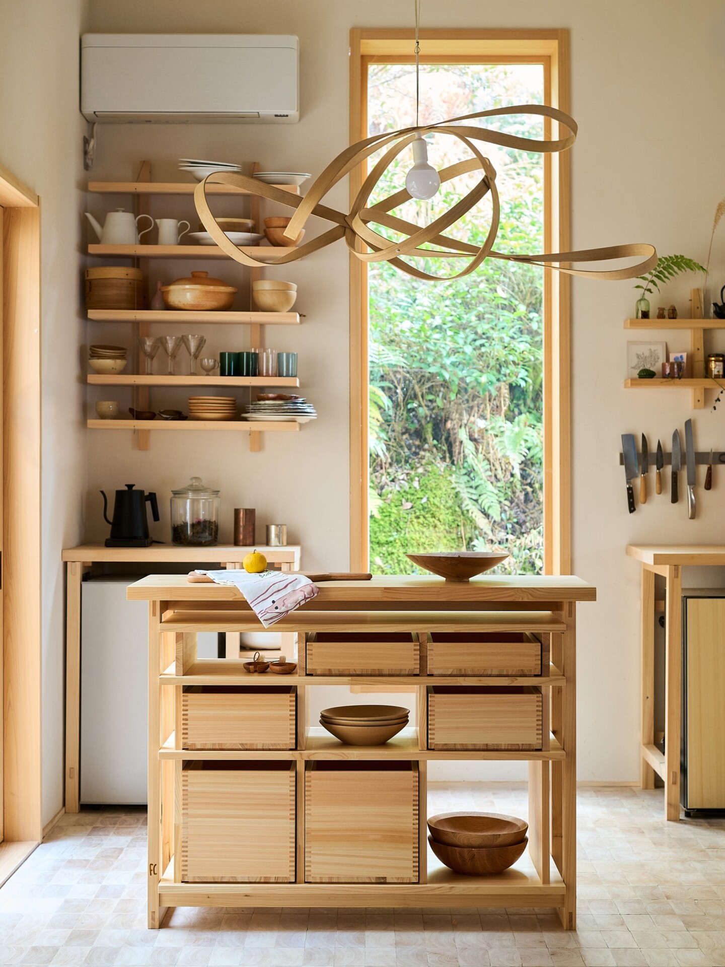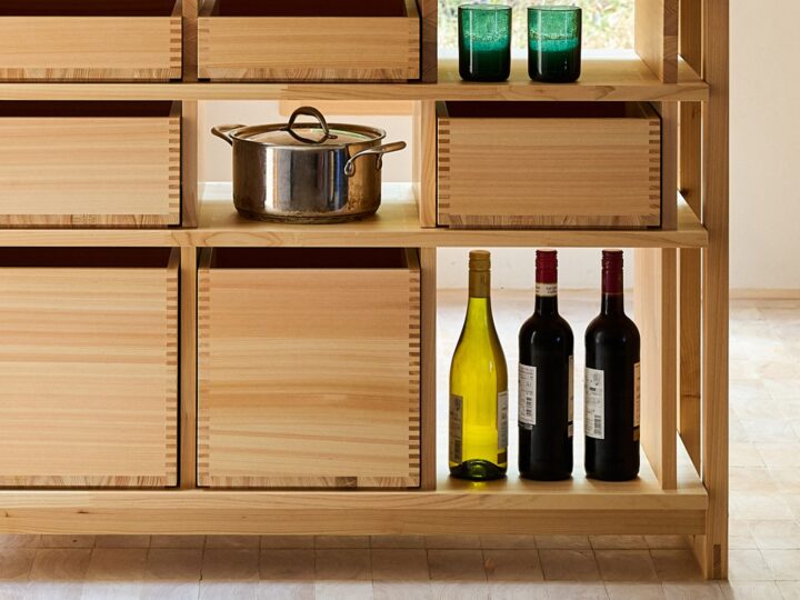 アイランドキッチンと収納ボックスのシリーズ「ISLAND+HELPFUL KITCHEN BOX」は、ヒノキ材の美しさと実用性に着目。キッチンを「生活の中心」と捉え、前後どちらからも使える構造や、空間を選ばない汎用性を持たせた。
