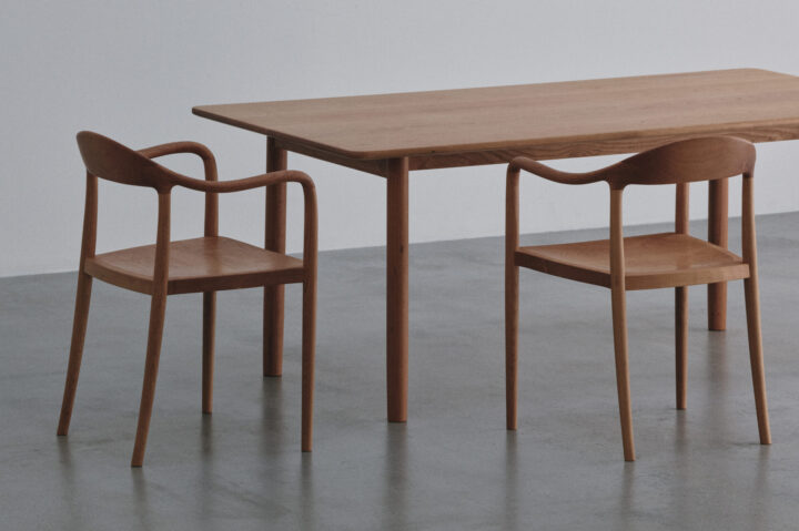 鈴木 元による「MIO」コレクションは、暮らしの風景に静かに馴染む佇まいが特徴だ。アトリエのある昭島の地下水が流れる風景をイメージし、水脈を連想させる「澪」から命名。柔らかな木肌と有機的なラインが心地良さを生み出している。「MIO CHAIR」の背から肘掛けへと続く複雑な三次曲面は、無垢材の特性を考慮しながらミリ単位で調整を重ねた。「MIO TABLE」では天板のエッジ20mmほどを段階的に薄くし、存在感を和らげつつ手を置いたときの安定感を確保している。