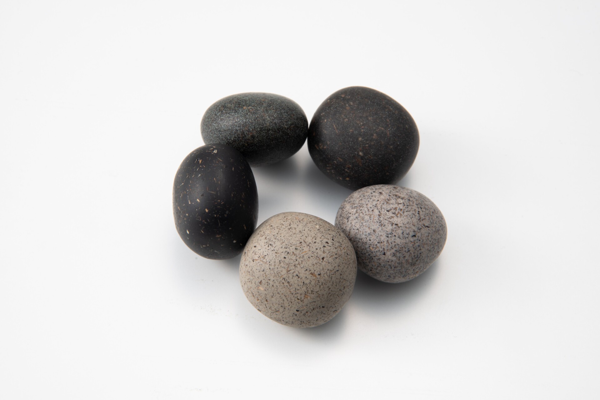 素材開発には、国広産業が50年以上培ってきた工業用研磨石の技術が活かされている。堆肥化された鹿の糞と天然鉱石、樹脂を配合し、着色剤を使わずに5色の色合いを表現。バレル研磨技術により、川辺の小石のような手になじむ質感に仕上げられている。