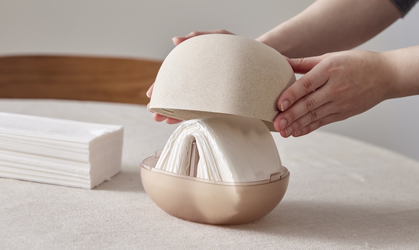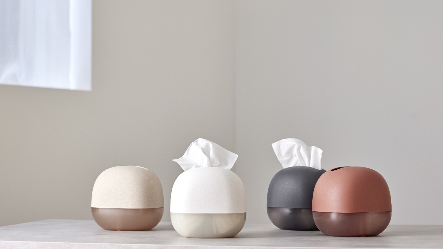 soemのTissue case foldとFlower vaseは、環境配慮素材の採用を、石油由来樹脂の削減量の話だけで終わらせず、もみ殻由来の粒感や再生材の透明感といった質感の個性として提示し、さらに省スペース化・残量確認、水替えの簡略化といった生活行動の改善に結びつけることに成功した。環境と暮らしのどちらかを優先するのではなく、「長く使いたくなる」体験設計によって結果的に廃棄を減らす。その思想が、素材・造形・機能の三層で一貫しているプロダクトだ。 ![]()