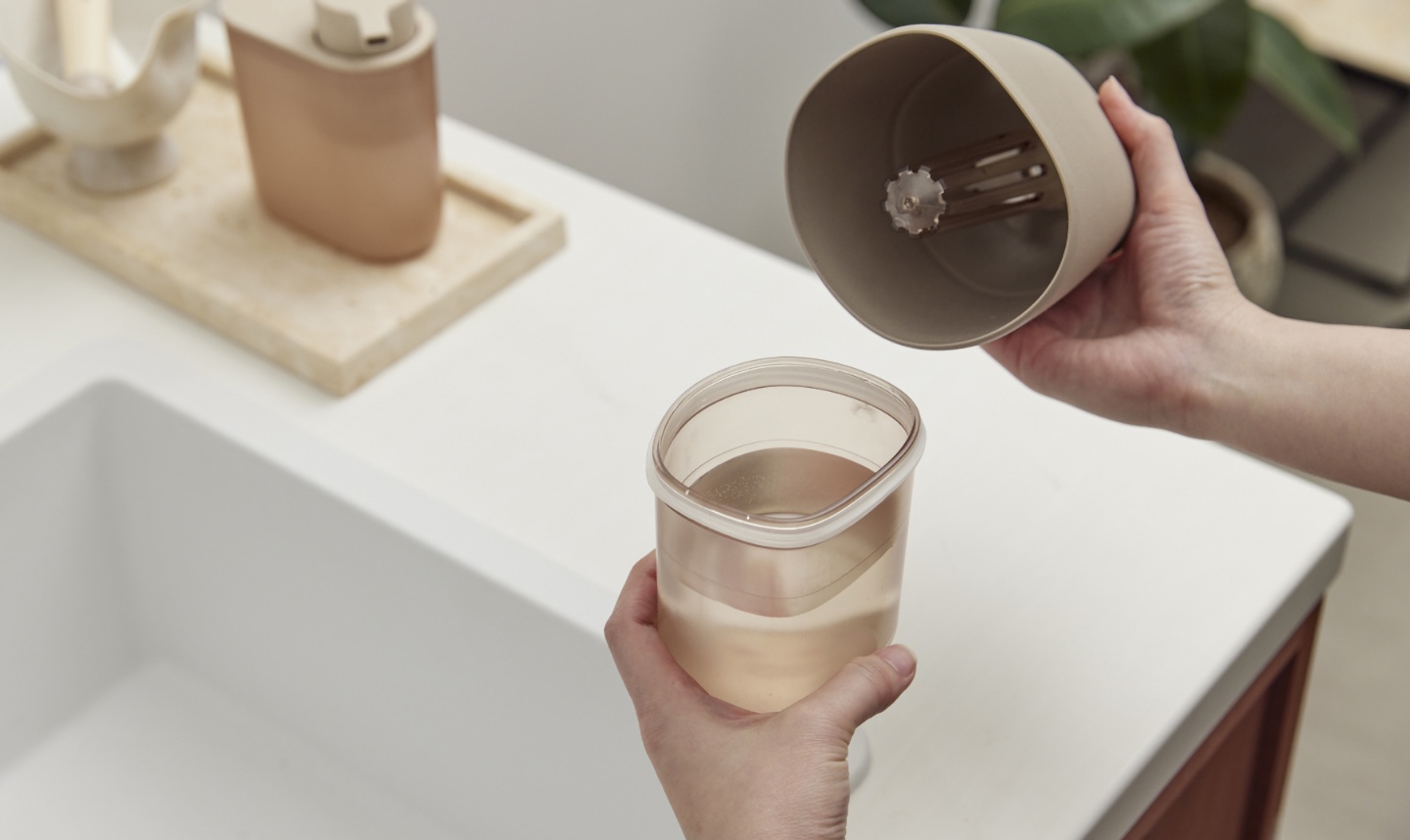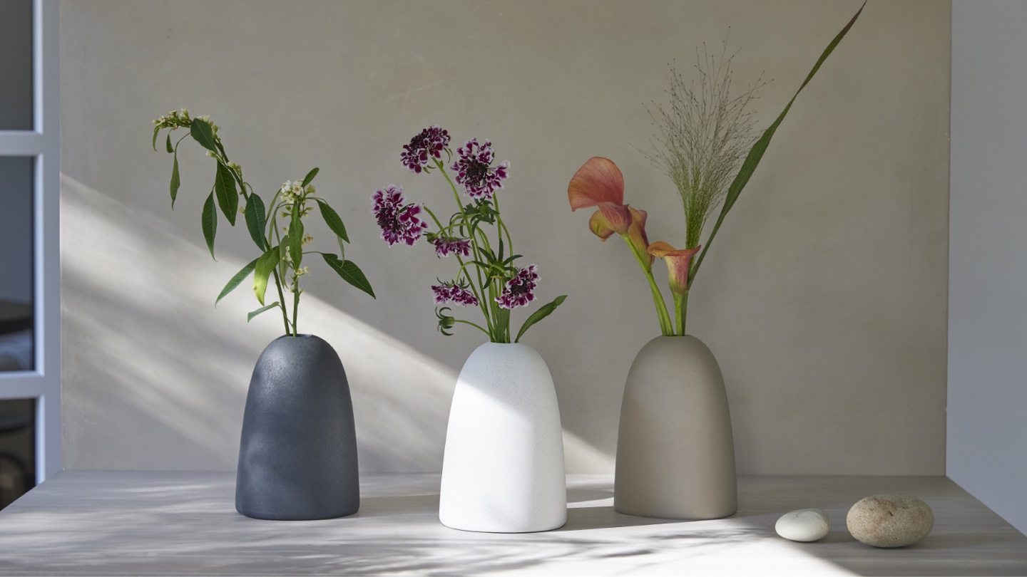 一方のFlower vaseは、花瓶にありがちな「水替えの面倒さ」をUXの中心課題として扱っている。石のように穏やかな外観と、陶器を思わせるしっとりした質感を狙い、緩やかなカーブのフォルムで花を主張しすぎずに引き立てる……という高いインテリア性を実現しつつ、TEXa製の本体+再生ポリカーボネート製のストレーナーと、同じく再生ポリカーボネート製の水カップの分離構造により、花を活け直さずに水替えができるようにした。これは「飾って終わり」ではなく「維持のしやすさ」まで含めて美しさを継続させることで、花がある生活を日常的なものにしやすくしたデザインと言えよう。