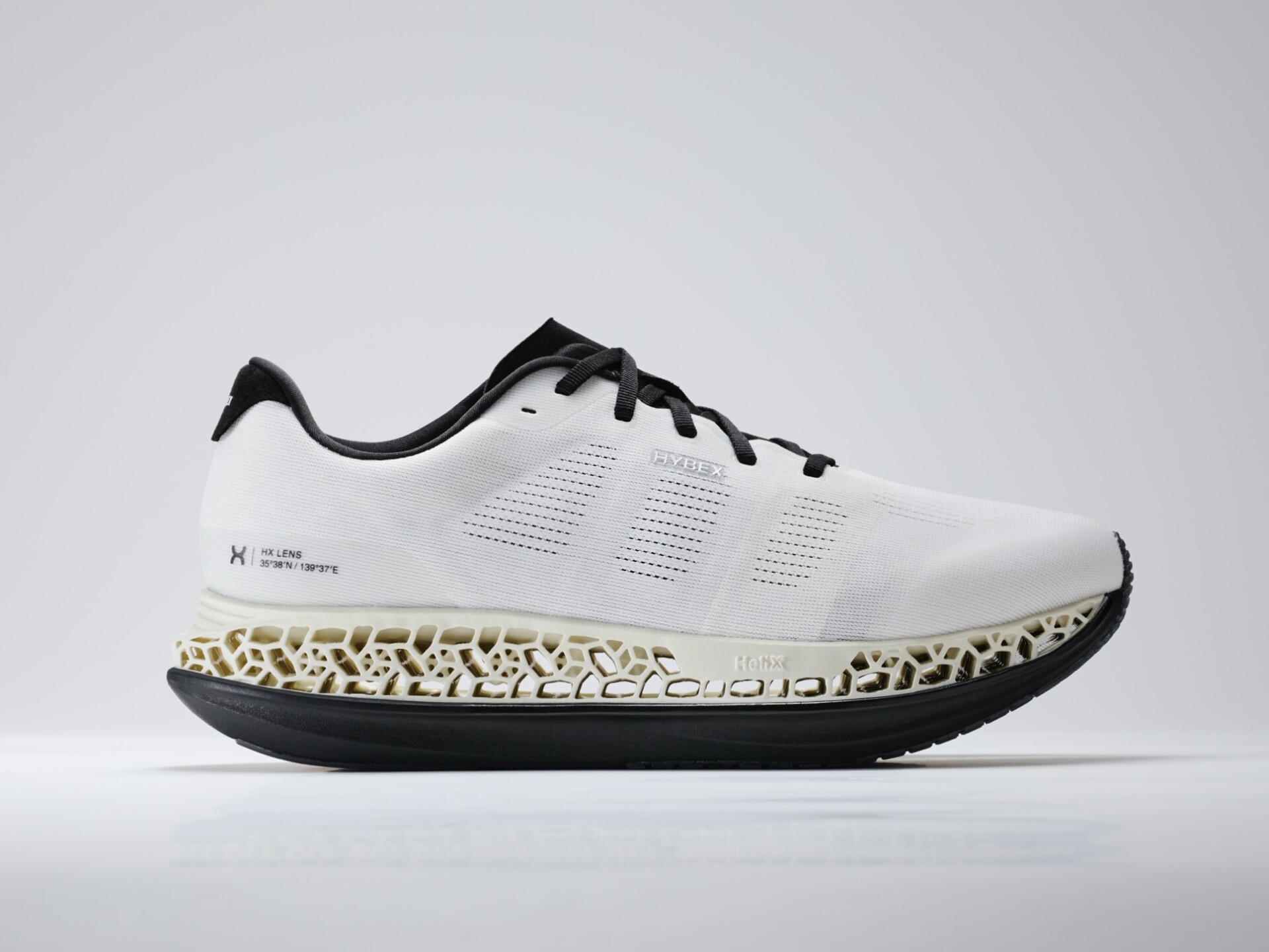 HX LENSは、特許取得済みの「HeliX(ヘリックス)ソール」を核に設計されている。着地時の衝撃を吸収しながらブレーキ力を低減し、そのエネルギーを前方への推進力へと変換する構造により、従来の設計では両立が難しかった高い衝撃吸収性と滑らかな体重移動を同時に実現するという。3Dプリント技術による上層部構造と、超臨界発泡フォームを用いた下層部構造を組み合わせることで、走行時のブレーキ感を抑えた推進性を生み出している。アッパーはゾーンごとに最適化されており、クリーンなシルエットも備える。